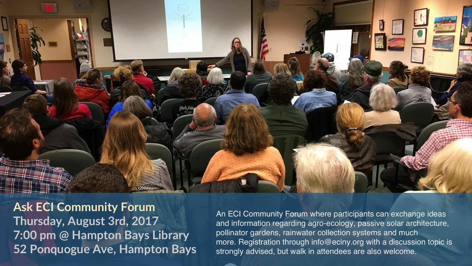 The Ecological Culture Initiative will host an "Ask ECI Community Forum" on Thursday, August 3rd, 2017 - 7 pm at the Hampton Bays Public Library.